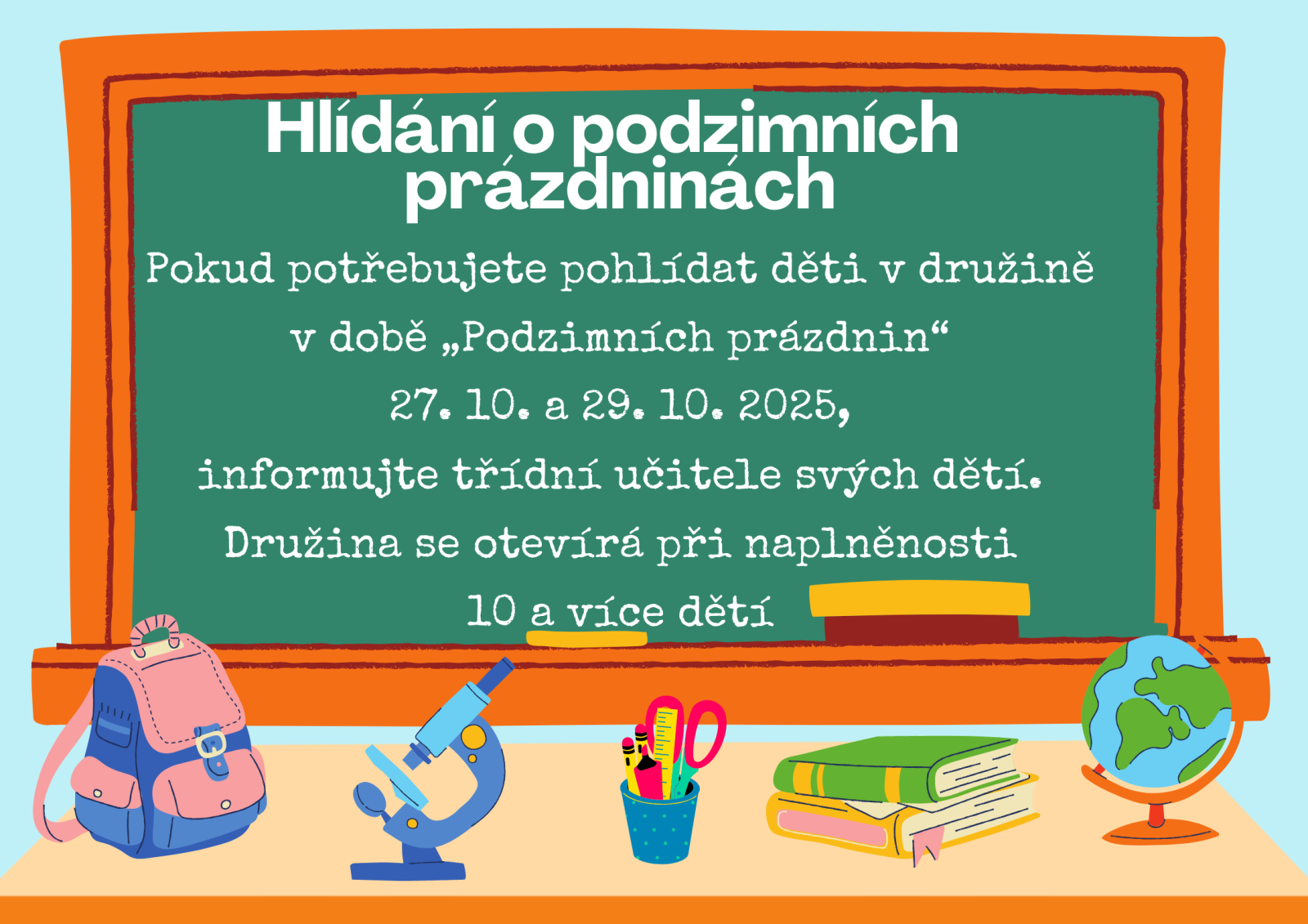 Pokud potřebujete pohlídat děti v družině v době „Podzimních prázdnin“ 27. 10. a 29. 10. 2025, informujte třídní učitele svých dětí.