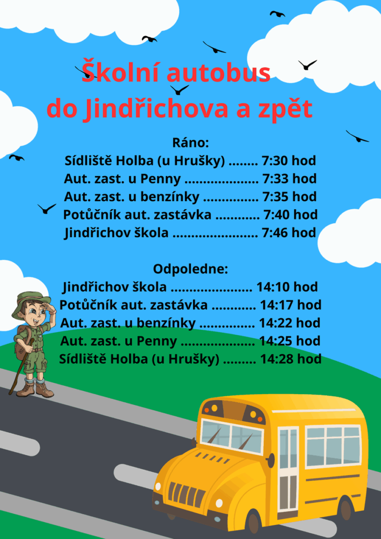 Školní autobus z Hanušovic do Jindřichova a zpět bude jezdit podle uvedeného jízdního řádu. Platba za autobus bude prováděna zpětně za uplynulý měsíc a cena se bude odvíjet od absolvovaných cest.